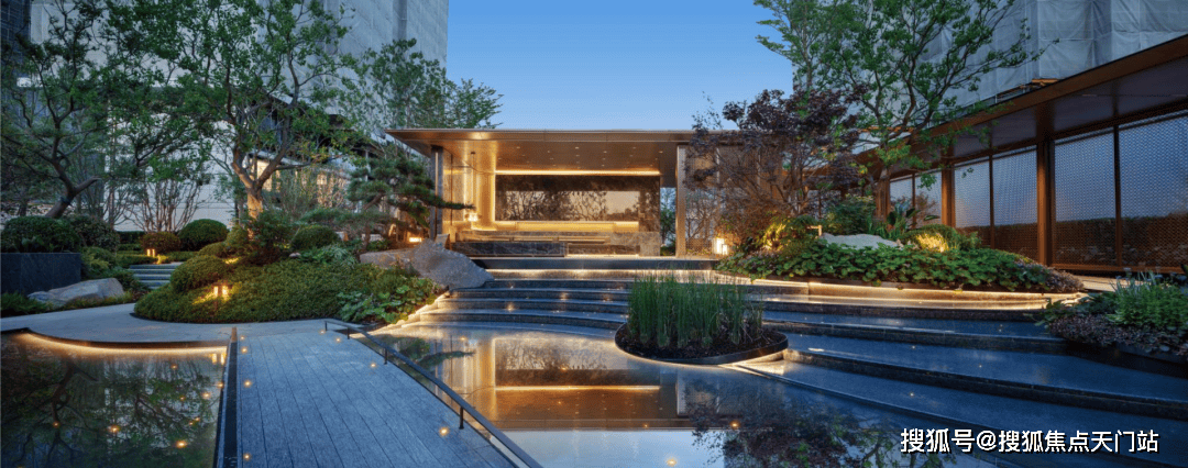 以上均已实景呈现,要晓得上海曾经很少有项目正在社区内引入水景了,种植了数株高峻细长的河桦和朴树,并镶嵌金属线条、就连地面都采用了夜里雪仿石砖